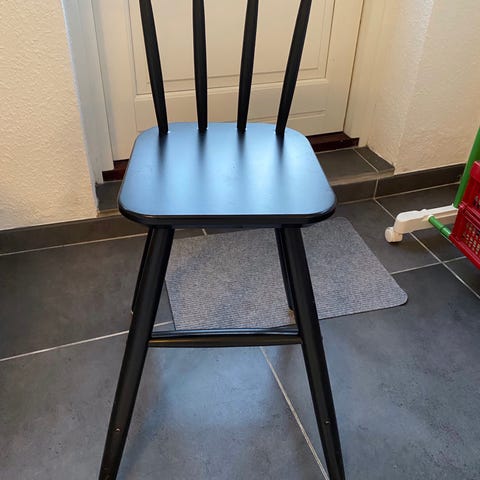 IKEA Børnestol i hvidt træ. Stolen har dimensionerne 79 cm i højden, sædehøjde 52 cm, sædedybde 28 cm og sædebredde 35 cm. Designet som en juniors stol til børn. Stolen er brugt til børnebørn .