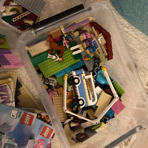 Legoklodser: blandede sæt i een stor pærevælling: Ninjago, spiderman, Friends. Blandt andet et Tivoli (Friends) som er stort set komplet. Jeg har serienumrene men manualerne ligger vist online.