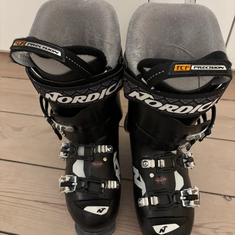 Nordica GT 12 skistøvler i størrelse 28,5. Farven er sort og grå. Skistøvlerne har fire spænder og termo custom fit teknologi for tilpasning. Designet til alpint skiløb. Nye såler.
