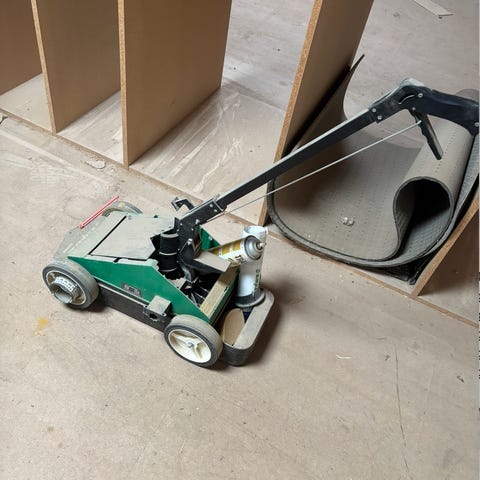 Spændemaskine med vogn og bånd. Maskinen har en lille defekt idet den ikke kan klemme så den spænder men den kan fint varme og den kører ellers helt som den skal. Der medfølger oplader.