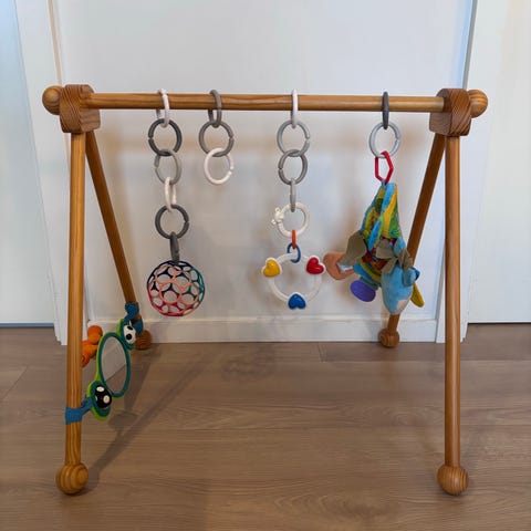 Helt enkelt aktivitetsstativ i bøgetræ fra Moulin Roty. Find selv rangler og sager at hænge på stativet. Så kan du også skifte ud, for mere variation for baby. Populær barselsgave eller dåbsgave.