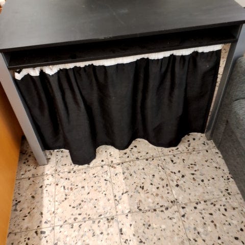 Et sort hyggeligt jern køkken board- sæt med 2 stole og en to person bænk, madrassen og pudderne tilhører med. Møblet kommer fra børn -ryg og dyrefri hjem. Kan transporteres med almindelig privat bil, og møblet kan afmonteres fra hinanden, der er skuer på.