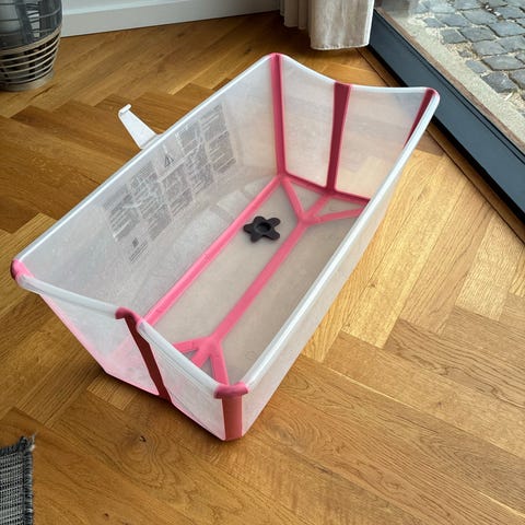 Stokke børnemøbel i lyserød farve. Designet til børn med fokus på funktionalitet og holdbarhed. Rejsebadekar med mål 64x32