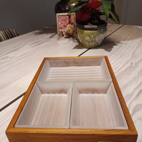 Bakke med skåle, Trip Trap, Trip Trap, Komethrien, består af bakke, 3 glasskåle og bagsiden er en fotoramme med passepartout.