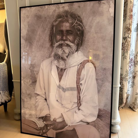 Stort billede af en ældre mand med hænderne delvist foran ansigtet. Billedet er i sort-hvide nuancer og har en realistisk stil. Det er indrammet og klar til ophængning. Billedet er 170x97
