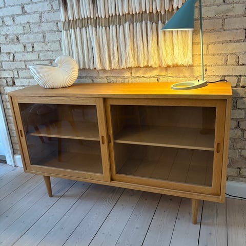 Børge Mogensen skænk fra Øresundsserien. Udført i egetræsfiner og med patinerede hængsler og greb. Benene er udskiftet til nye i egetræ, som vi synes passer perfekt dertil.