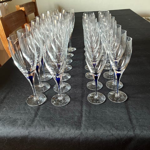 Brugt ganske få gange - måske 10…De lidt sjældne Orrefors glas med sort dråbe istedet for den klassiske blå. Sæt bestående af 1 karafel, 20 glas ( 7 rødvinsglas, 6 hvidvinsglas, 5 portvinsglas og 2 champagneglas.