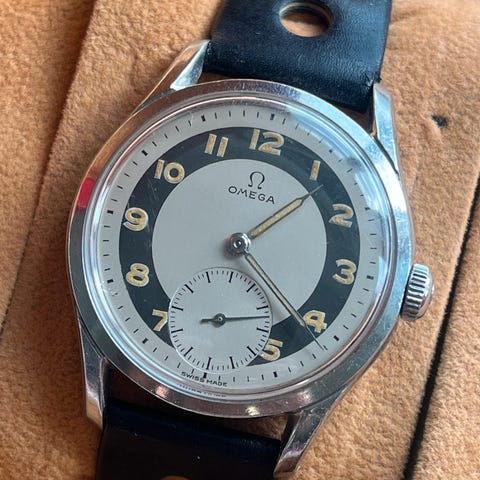 Vintage Omega Suverän i rustfrit stål fra 1944. Værket er Omega in-house cal. 30 T2 PC med lille sekundviser. Det er et af de tidligere versioner af det berømte 30mm Omega værker. Både kasse og bag-kasse er i rustfrit stål. Serie nr. 10.238.XXX daterer uret til 1944. Der er monteret nyt glas og stål krone. Ref. nr. 2400 og diameter er 35 mm. Smuk two-tone sort/hvid patineret Bullseye skive med sjældne Romertal og klassiske Suverän visere. Uret er serviceret i januar 2026 og det går og holder tiden fint. Der er monteret en passende ny sort læderrem. Der er mulighed for anden farve rem. Uret leveres i en original Omega æske fra tiden omkring WWII. Der ydes 14 dages returret. Modellen Suverän blev solgt kun i Sverige i tiden omkring Anden Verdenskrig og er eftertragtet model blandt samlere. Dette er et af de sjældne eksampler grundet Romertal på skiven. Uret leveres i en original Omega æske fra perioden. Husk, at se andre spændende ure, som jeg har til salg herinde:-) !!!KUN SERIØSE HENVENDELSER!!!