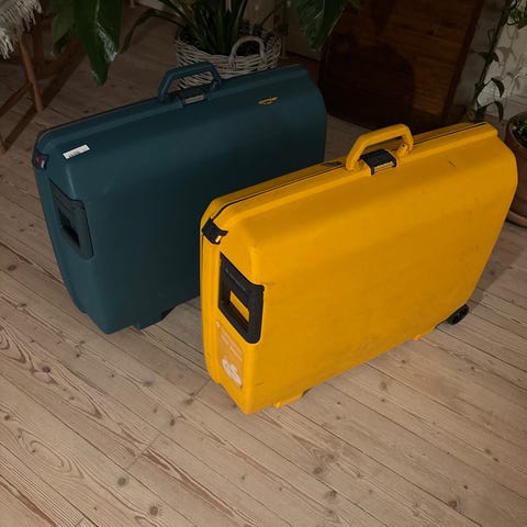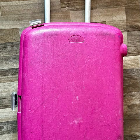 Samsonite skalkuffert i plastmateriale. Kufferten er rød og har en låsemekanisme med kodesystem. Indvendigt er den udstyret med elastiske stropper til fastgørelse af indholdet.