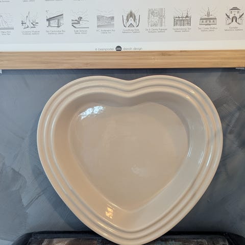 Le Creuset hjerteformet keramisk fad med låg rød og beige