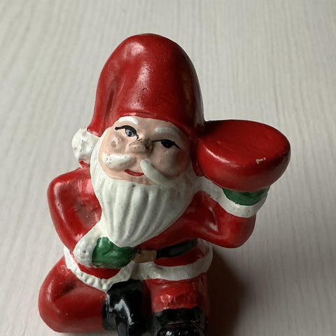 Nissen tager sig en lur mens han sparer op til julegaverne. Den er ca. 12 cm lang.