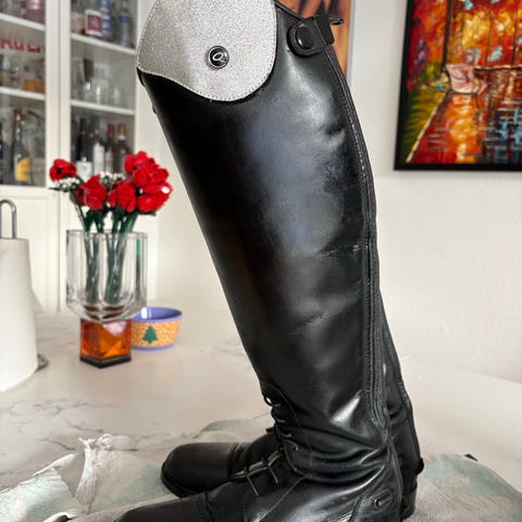 På toppen af støvlen er der en velcrokant, så de smarte velcroclips kan fastgøres til ridestøvlen.