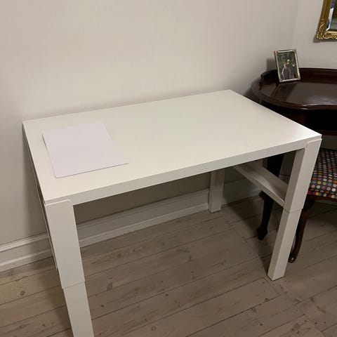 Hvidt skrivebord der kan instilles i tre forskellige højder. Skrivebordets højde kan nemt indstilles til 59, 66 eller 72 cm med knopperne på benene. Bredde: 96 cm, Dybde: 58 cm, Min. højde: 59 cm, Maks. højde: 72 cm, Maks. belastning: 50 kg. Nypris 549.