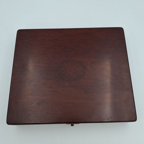 Velholdt tung bronze cigarkasse med træindmad. Ydermål er 16*11*4cm