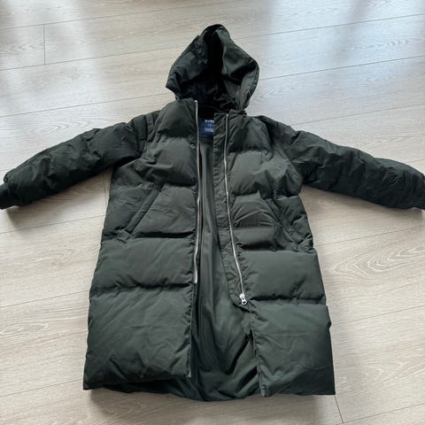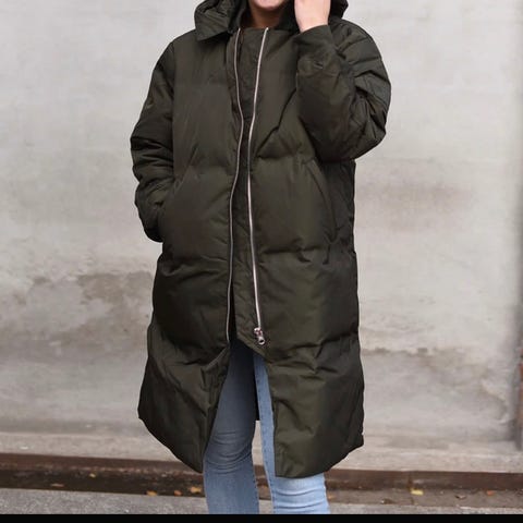Man holder sig virkelig varm i den - også da den dækker lårene. Hætten kan tages af.