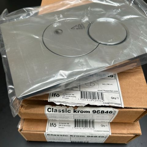 Ifö Sign betjeningspanel med dobbelt skyl i krom finish. Betjeningspanelet er designet til brug med Ifö Sign toiletter og har to knapper til valg af skyllemængde.