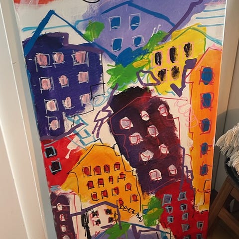 Str. 50 x 70 cm. Maleri med motiv af abstrakte bygninger i forskellige farver som rød, gul, blå og sort. Maleriet indeholder geometriske former og farveblokke, der danner en bysilhuet. Velegnet til vægdekoration.