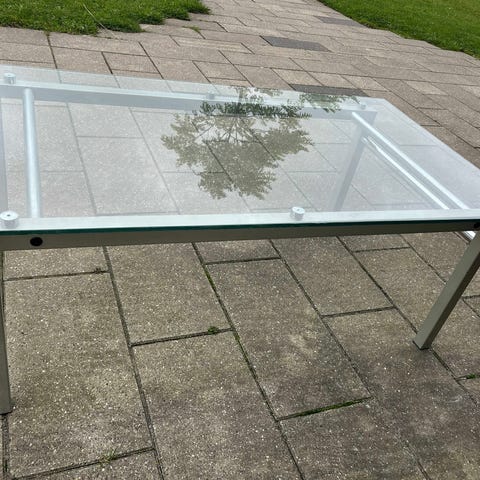 Sort glasbord med nogle ridser. Bordet er asymmetrisk (bredere i den ene ende) . Fodene er i stål og kan skrues fra bordpladen ved transport.