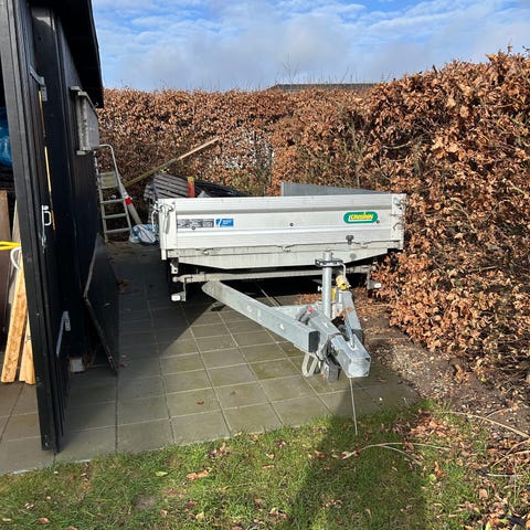 Solid og velholdt Neptun N15-256 tiptrailer med manuel hydraulisk kip Perfekt til haveaffald, grus, jord, brænde eller byggeprojekter.