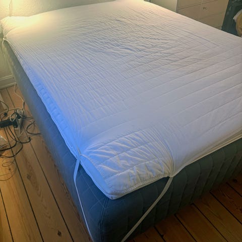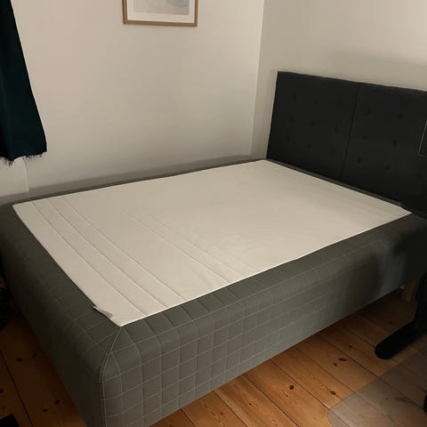 IKEA Skotterud seng med polstret overflade. Sengen har en grå farve og er designet til almindelig brug. Størrelse 140x200 inkl. topmadras