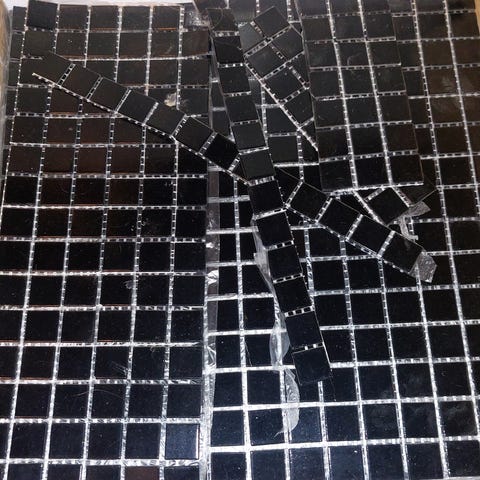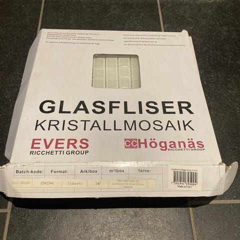 Evers Glasmosaik i formatet 23x23x4 mm (på net). Farven er hvid (glas) metallic glossy (83).
