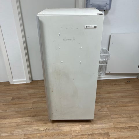 Gram køleskab som er brugt som ekstra køl i kælderen. Højde 1220 cm, bredde 55,8 cm, dybde 60 cm. Almindeligt slid kan ses, fungerer som det skal.