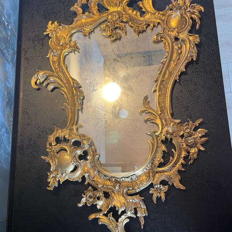 Antikt vægspejl med en gylden ramme. Spejlet har dekorative detaljer i hjørnerne og en vintage finish. Velegnet til ophængning i boligindretning.der mangler lidt i venstre hjørne nederst vist på et billed.....mål 139x114