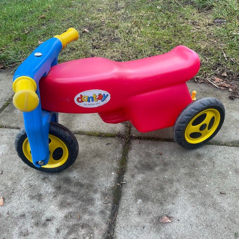 Legetøjsmotorcykel til børn i rød og blå farve med tre hjul. Fremstillet i plastikmateriale og designet til små børn som en balance- og kørelegetøj.