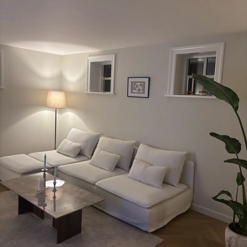 Modellen Söderhamn fra IKEA i farven Fridtuna lys beige med chaiselong, som kan omrykkes.