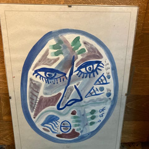 Kleine 6 Maleri med farverigt motiv på lærred. Maleriet forestiller flere figurer i forskellige farver og størrelser på en grøn baggrund. Velegnet til dekorative formål i hjem eller kontor.