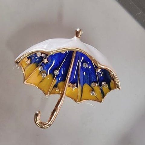 Rigtig sød broche med en sammenklappet paraply helt fyldt med lyseblå skinnende sten. Brochen er antikforgyldt og den måler 2x6,5 cm. Brochen er helt ny