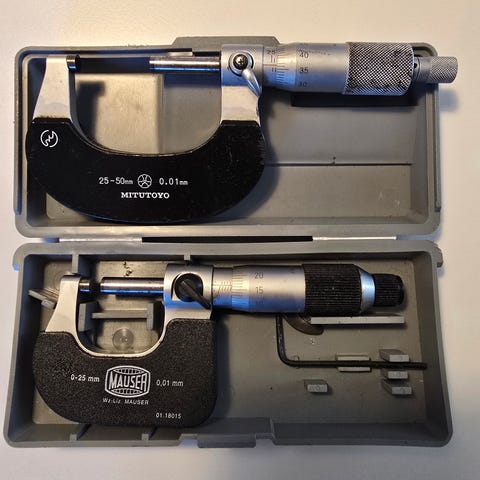 Diesella indvendige mikrometre sæt med fire stykker, der måler fra 5 til 100 mm med en nøjagtighed på 0,01 mm. Sættet leveres i en opbevaringskasse og er produceret i Danmark.
