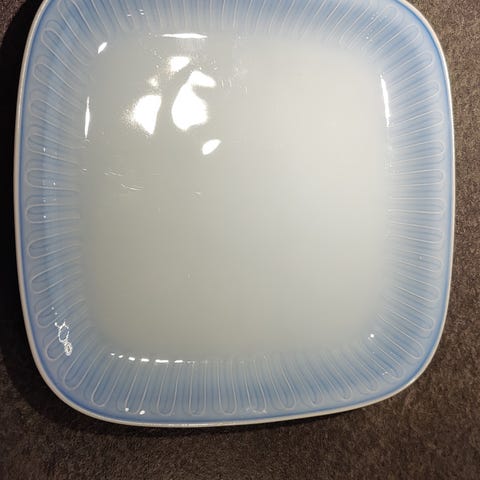 Bing & Grøndahl firkantet tallerken med blå kant. Tallerkenen har en glat overflade og et enkelt design med blå striber langs kanten. Egnet til daglig brug i køkkenet.