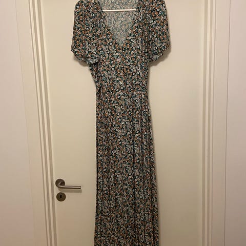 Oysho blomstret sommerkjole i blå-grøn-lysegul farve (mørkeblå baggrund), str. M. Viskose. Korte ærmer, knapper fortil, bindebånd i taljen (kan bindes både for og bag). Brugt én gang - som ny. Fra ikke-ryger hjem og -menneske :)