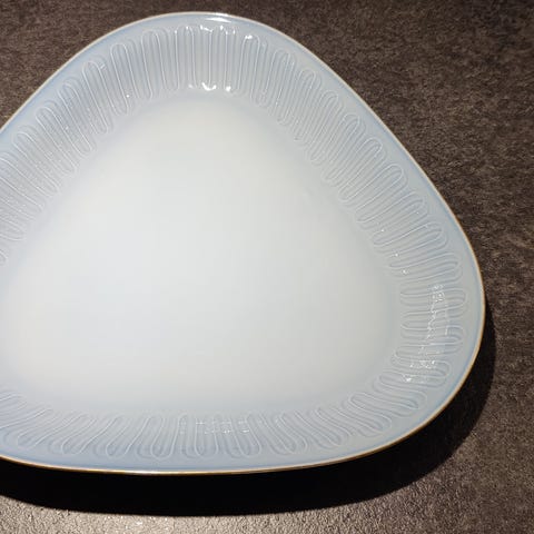 Bing & Grøndahl fad i hvidt porcelæn med dekorativ kant. Fadet har en aflang form og kan anvendes til servering af mad eller som dekorativt element i køkkenet.