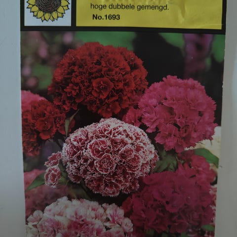 Frø til dyrkning af hvide havenelliker (Dianthus caryophyllus). Frøene er beregnet til udendørs brug i haver og kan dyrkes under passende vækstforhold.