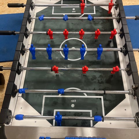 Roberto Sport bordfodboldbord med sort kabinet og røde og blå spillere. Bordet er udstyret med en møntindkastmekanisme til brug i offentlige miljøer. Designet til indendørs brug og egnet til bordfodboldspil for alle aldersgrupper.