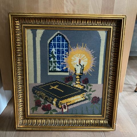 Messing ramme med broderi høj 27 cm -bredde 18 cm, broderi af 2 roser på gren. messing ramme intakt lige til at hænge op.