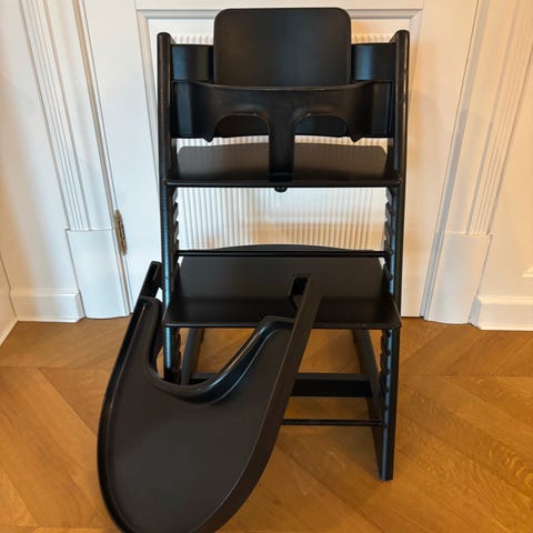 Fin Trip Trap stol med tilhørende baby indsats og bord fra stokke. Derudover medfølger nyere newborn indsats med 2 indstillinger. Enkelte mindre brugsspor