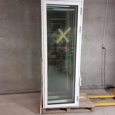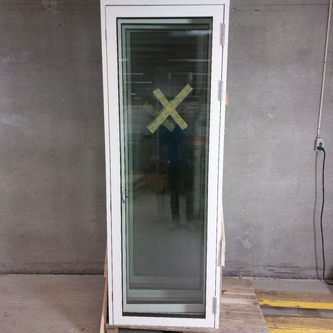 Terrassedør i træ/alu med 3-lags energirude, lavt glasfiberbundstykke og 3-punktslås. Har et par små skrammer, se billeder.