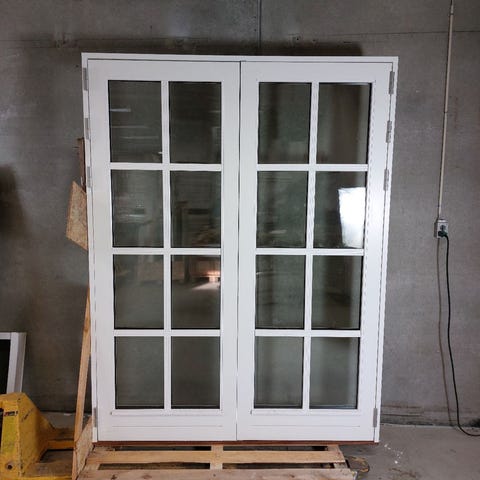 Dobbelt terrassedør i træ med 2-lags energiruder, hårdttræsbundstykke, sprosser og 3-punktslås. Bemærk at den er lys grå udvendigt.