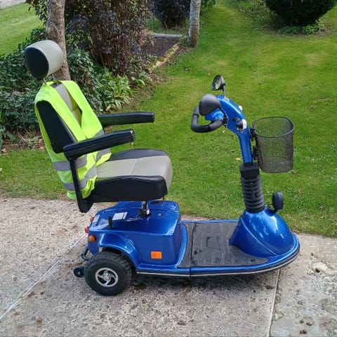 Velholdt el-scooter i blå farve med fire hjul, justerbart sæde med ryglæn og nakkestøtte. Udstyret med frontkurv til opbevaring. Designet til brug som mobilitetshjælpemiddel.