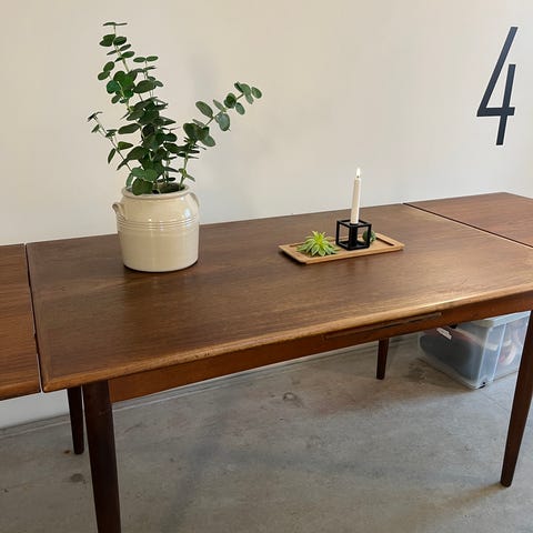 Fint egetræs udtræksbord, der dog lige trænger til en slibning og olie.