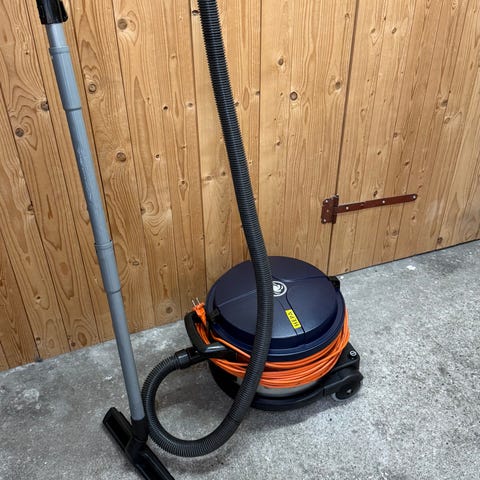 Nilfisk støvsuger med integreret kabeltromle. Produktet indeholder en lang ledning, der kan rulles op på tromlen for nem opbevaring. Støvsugeren er designet til effektiv rengøring og nem håndtering.