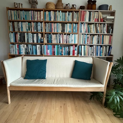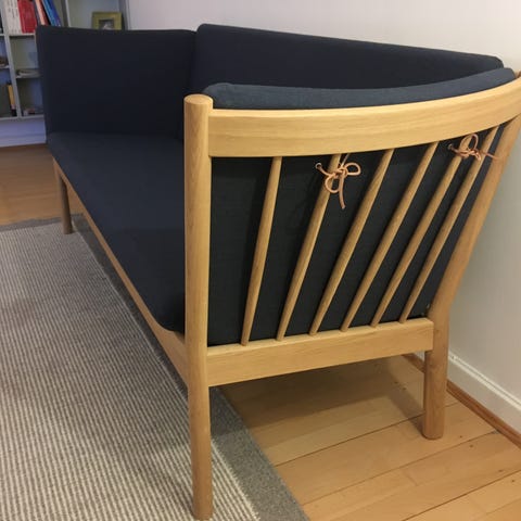 Model J 148 designet af Erik Ole Jørgensen. Stel af massiv bøgetræ i fin tilstand. Hynder betrukket med alcantara med brugsspor. Sofaen fremstår med en lethed og fylder ikke meget. Den har en god siddekomfort.