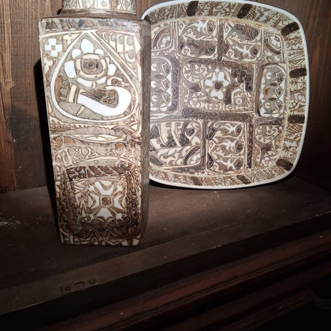 Smukt og sjældent sæt fra 1970’erne bestående af 22 cm fad og matchende beholder/krukke. 1. sortering (A-mærke). Meget flot stand uden skår eller revner. Klassisk nordisk relief-dekoration.