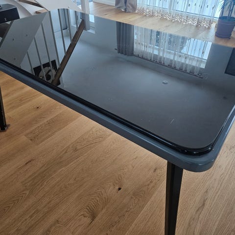 Bordpladen ligger frit i spænd på to metalstel (kig foto)