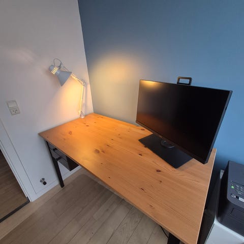 Sælger dette træ skrivebord med to skuffer og et opbevaringsrum. Benene kan tages af.