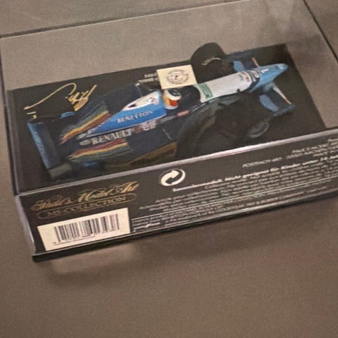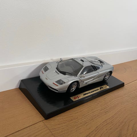 McLaren MP4/5 Formel 1 modelbil i skala 1:43. Model af bilen fra sæsonen 1990, kendt for at være verdensmesterbil med Honda motor. Fremstillet med detaljerede komponenter og monteret på en sort base med gennemsigtig beskyttelseskuppel.