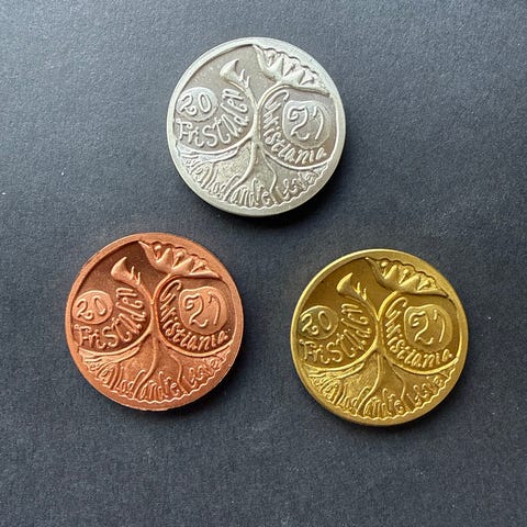Christiania samlermønter i tre forskellige farver: gul (messing), sølv og kobber. Mønterne viser motiv af et utraditionelt hus på Christiania og er markeret med værdien 1 Løn. 2022. Velegnet til samling eller som souvenir.